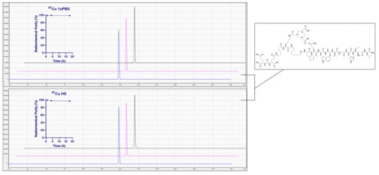 Stability assays of [DUPA-6-Ahx-([67Cu]Cu-NOTA)-8Aoc-BBN ANT] evaluated at 1 (blue), 4 (pink), and 18 h (black) time points in phosphate-buffered saline (PBS) (21 °C) or human serum (37 °C).