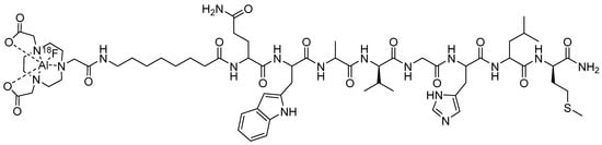 Perhaps one of the more exciting radiolabeling strategies in the last 50 years is that of using the Al[18F]F method to complex [18F] to biologically active cell-targeting moieties [29]. In this method, researchers have utilized the inherent coordinating ability of the nitrogen atoms of NOTA to complex the Al[18F]F2+ cation. Dijkgraaf and co-workers have produced [Al[18F]F-NOTA-8-Aoc-BBN(7-14)NH2] (Figure 9) as a potential GRPR PET-imaging agent [71]. In this study, the radiosynthesis of [Al[18F]F-NOTA-8-Aoc-BBN(7-14)NH2] was efficient, and the product was purified using reversed-phase HPLC. In a competitive binding assay using nonradioactive [Al[natF]F-NOTA-8-Aoc-BBN(7-14)NH2], a very high binding affinity for the GRPR expressed on the surfaces of PC-3 cells (IC50 of 0.28 ± 0.15 nM) was observed. In vivo studies conducted in male nude BALB/c mice bearing subcutaneous PC-3 tumors showed tumor accumulation values of 2.15 ± 0.55% ID/g at 1 h p.i. Tumor uptake was effectively reduced by co-administration of macroscopic amounts of [NOTA-8-Aoc-BBN(7-14)NH2], confirming receptor-mediated uptake of the radioligand for the GRPR [71]. The renal-urinary excretion pathway was the primary route of excretion for this agent despite the production of an overall neutral metal-NOTA complex. Small animal PET/CT produced high-quality, high-contrast images with clear tumor accumulation of the [Al[natF]F-NOTA-8-Aoc-BBN(7-14)NH2] conjugate [71]. In the same study, the authors reported uptake of [[68Ga]Ga-NOTA-8-Aoc-BBN(7-14)NH2] radiotracer in GRPR-expressing PC-3 tumors to be 1.24 ± 0.26% ID/g at 1 h p.i., suggesting the superiority of using the Al[18F]F method of radiosynthesis to produce clinically useful cell-targeting agents for PET imaging of GRPR-expressing tumors.