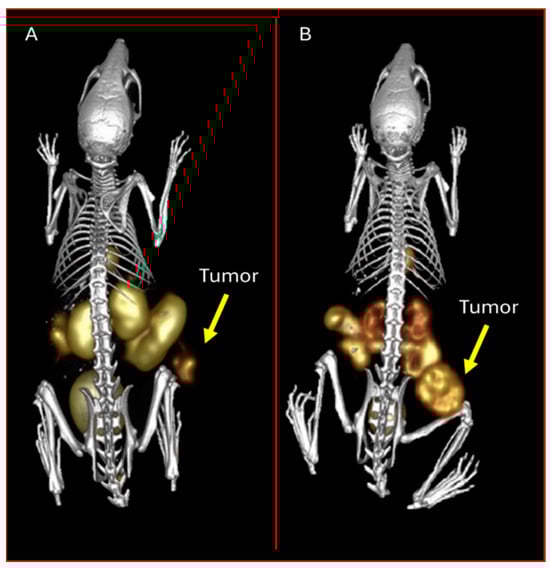 Micro-SPECT/CT images taken at 1 h p.i. in mice bearing AR42J tumors on the right hind flank (7.4 MBq). (A) [[99mTc][Tc(OH2)3(CO)3]-NODAGA-SST2-ANT] and (B) [[99mTc][Tc(OH2)3(CO)3]-NOTA-SST2-ANT]. The tumors (T) are indicated by the yellow arrows. The figure was adapted and modified with permission from reference [86].