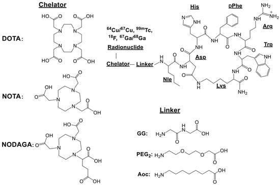 Schematic representation of MC1R-targeted DOTA/NOTA/NODAGA-conjugated CycMSHhex with different linkers and radionuclides.
