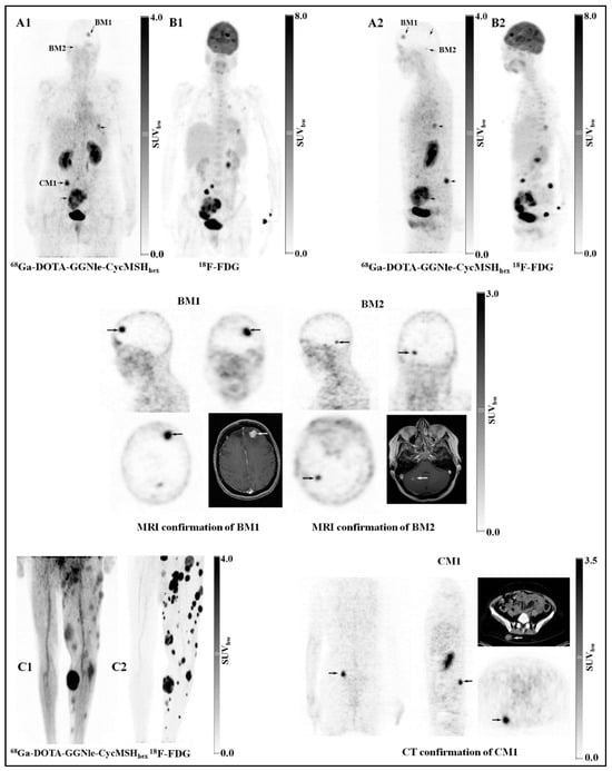 Representative first-in-human PET studies on two melanoma patients. Melanoma metastases in the brain, lung, connective tissue, and small intestine of patient 1 (A1,A2) were visualized by PET using [[68Ga]Ga-DOTA-GGNle-CycMSHhex]. Melanoma metastases on the left leg of patient 2 (C1) were imaged by PET using [[68Ga]Ga-DOTA-GGNle-CycMSHhex]. [18F]F-FDG PET (B1,B2,C2) studies were performed on the same patients for comparisons. The melanoma metastases in the brain (BM1 and BM2) were confirmed by MRI and the metastasis in the connective tissue (CM1) was confirmed by CT. Melanoma metastases are highlighted with arrows on the images. SUVbw, standardized uptake value based on body weight. The figure was adapted and modified with permission from reference [93].