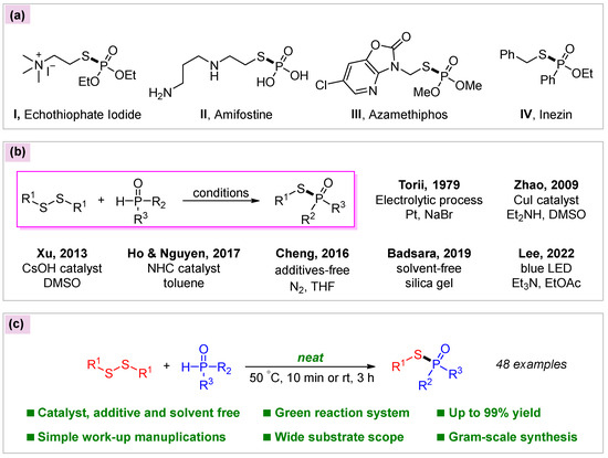 Phosphinothioates, phosphonothioates, and phosphorothioates, containing a typical P(O)-S group, are intriguing structural motifs that have great potential in the areas of pharmaceuticals [1,2,3,4,5], agrochemicals [6,7,8,9], and materials [10,11,12,13]. In the fields of medicinal and agricultural chemistry, some representative biologically active phosphonothioates and phosphorothioates are illustrated in Figure 1a, such as echothiophate iodide (I) [14,15], which is used for accommodative esotropia, amifostine (II) [16,17] for cancer adjuvant therapy, azamethiphos (III) [18,19] for insecticide, and inezin (IV) [20,21] for fungicide (Figure 1a). While the synthesis of these compounds can be achieved via relatively multifarious methodologies, traditional approaches generally rely on the incorporation of the toxic and moisture-sensitive halides R2P(O)Cl or RSO2Cl for nucleophilic substitution or Michaelis–Arbuzov reaction [22,23,24,25,26,27]. In particular, disulfides are attached to the HP(O) species (diarylphosphine oxides, dialkylphosphites, and phosphinates) to access phosphinothioates, phosphonothioates, and phosphorothioates. This has become a powerful method (Figure 1b). Pioneering work on direct coupling of dialkyl- or diarylphosphites and disulfides was achieved by Torii using an electrolytic technique with the assistance of NaBr [28]. In 2009, Zhao and co-workers developed a transition-metal catalysis protocol for the preparation of phosphorothioates from dialkylphosphites employing CuI as catalyst and Et3N as base [29]. Since then, a variety of relatively straightforward and effective methods based on disulfides have been reported, including base catalysis [30,31,32], N-heterocyclic carbene (NHC) catalysis [33], and photocatalysis [34]. Without any catalyst or oxidant and solely utilizing THF as the solvent under an N2 atmosphere, disulfides were coupled with diarylphosphine oxides [35]. Further, Badsara discovered that disulfides and diarylphosphine oxide could be efficiently converted in air at room temperature by employing inexpensive silica gel as the medium [36]. Most of these disulfide-based methods are characterized by simple conditions and convenient manipulations; however, the fly in the ointment is that the use of organic solvent or other types of media remains unavoidable.