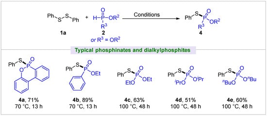 Next, we examined several HP(O) species that contain at least one P-O bond, specifically focusing on phosphinates and dialkylphosphites (Figure 3). Unlike diarylphosphine oxide substrates, these substrates exhibited comparatively lower reactivity with diphenyl disulfide 1a and required higher reaction temperature as well as extended reaction time. For example, 6H-dibenzo[c,e][1,2]oxaphosphinine 6-oxide (DOPO), a flame retardant intermediate, showed good reactivity and generated the desired product 4a with 73% yield at 70 °C for 13 h. (Ethoxy)phenylphosphinate gave a better yield of 89% for 4b than DOPO under similar conditions. Though dialkylphosphites were also compatible with 1a, relatively lower yields of 4c–4e were obtained at an elevated temperature (100 °C) and longer time (48 h).