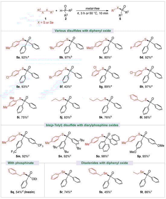 As part of an ongoing research program in our group towards developing disulfides as viable feedstocks for organosulfur molecule synthesis [37,38], we are also very concerned about the development of disulfide-involved green synthetic methods, especially focusing on enhancing the simplicity of reaction systems, minimizing additive usage, and improving the convenience of work-up operations [39,40,41,42]. Herein, we report our efforts for the coupling of disulfides and HP(O) species without solvent or any additive under air, merely involving heating or stirring at room temperature. Broad substrate compatibility was demonstrated by successfully engaging substrates including diarylphosphine oxides, dialkylphosphites, and phosphinates with disulfides (Figure 1c).
