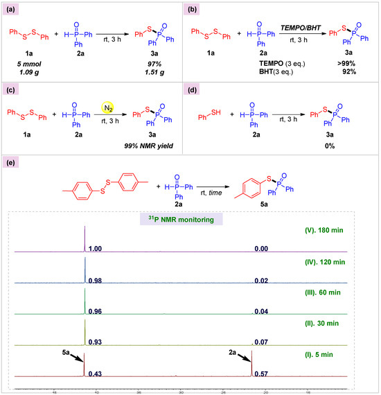 To demonstrate the synthetic utility of our protocol, we applied this method to the preparation of 3a on a 5 mmol scale, and the reaction occurred smoothly at room temperature to give 3a in a nearly quantitative yield (Figure 5a). Then, to gain further insights into this reaction, we conducted several control experiments (Figure 5b–e). Based on Han’s radical 1,2-bisphosphorylation of alkynes [43], we first considered whether this coupling proceeded via a radical process. When 3 equivalents of a radical scavenger, TEMPO or BHT, were added, the reaction still ran well to produce 3a with 99% and 92% yields, respectively (Figure 5b). What is more, running the reaction under an N2 atmosphere brought about 3a in a yield of 99% (Figure 5c). These results suggested that this transformation might not involve a radical mechanism. Thiophenol, the only by-product observed in the reaction process, did not couple with diphenylphosphine oxide 2a (Figure 5d), implying that thiophenol was probably not a reaction intermediate. A series of 31P NMR monitoring experiments were then performed with model 2a using bis(p-tolyl) disulfide as the coupling partner (Figure 5e). According to the integral area of 5a and 2a, we could clearly observe that no other phosphorus-containing intermediates were formed during the reaction.