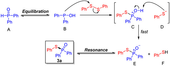 Based on our experimental findings, we hypothesize that the reaction proceeds through a classical ionic process, shown in Figure 6. The nucleophilic hydroxydiphenylphosphane B, the equilibration form of diphenphosphine oxide A, attacks diphenyl disulfide to give a possible ion pair that is composed of a phosphonium cation C and a thiophenol anion D. Fast intramolecular proton transfer of this ion pair occurred to generate the desired product 3a (resonant structure E) and the by-product thiophenol F.