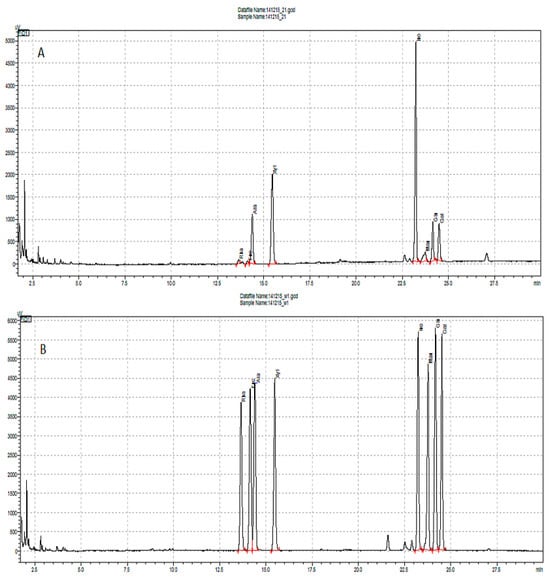 Raspberry fruit after pectin hydrolysis procedure, GC-FID chromatograph (A), and standards chromatograph (B). At 13.640 min rhamnitol per acetyl; 14.131 min fucitol per acetyl; 14.377 min arabinitol per acetyl; 15.461 min xylitol per acetyl; 23.225 min inositol per acetyl; 23.786 min mannitol per acetyl; 24.146 min glucitol per acetyl; 24.492 min galactitol per acetyl.