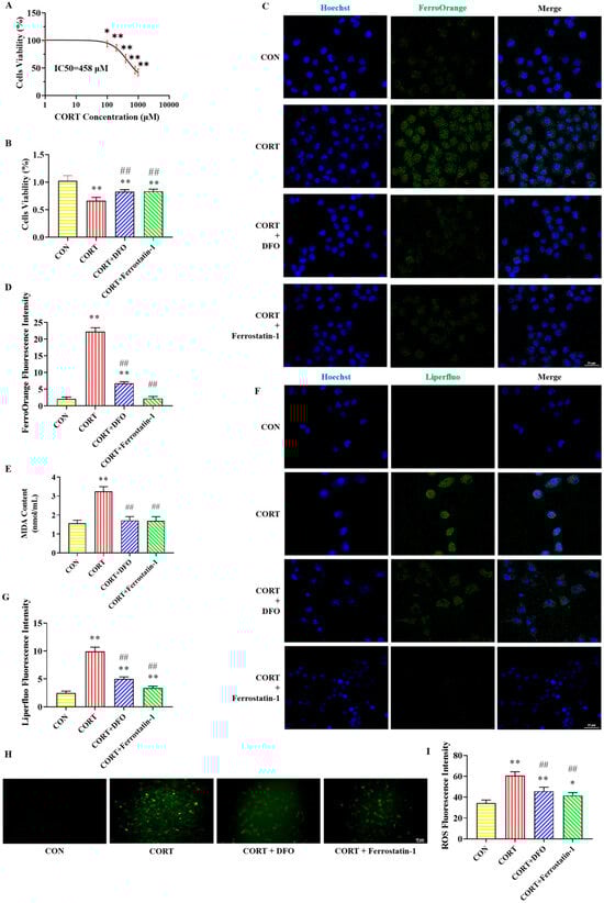 Effects of DFO and Ferrostatin-1 on CORT-induced ferroptosis in PC12 cells. (A) PC12 cells’ viability after treatment with different concentrations of CORT. (B) The viability of PC12 cells after different treatments. (C) Representative FerroOrange (green) positive cells immunofluorescence images at 400× magnification. Nuclei were stained with Hoechst (blue) in PC12 cells. Scale bar = 25 μm. (D) The fluorescence intensity of iron. (E) The content of MDA. (F) Representative Liperfluo (green) positive cells immunofluorescence images at 400× magnification. Nuclei were stained with Hoechst (blue) in PC12 cells. Scale bar = 25 μm. (G) The fluorescence intensity of LPO. (H) Representative ROS immunofluorescence images of PC12 cells at 200× magnification. Scale bar = 50 μm. (I) The fluorescence intensity of ROS. All data are presented as the mean ± SD (n = 6). * p < 0.05 and ** p < 0.01 versus CON group. ## p < 0.01 versus CORT group.