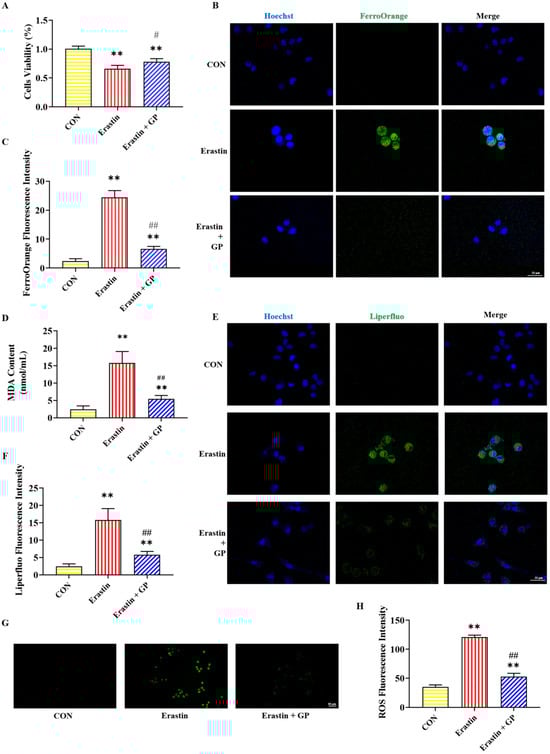 Effects of GPs on Erastin-induced ferroptosis in PC12 cells. (A) The viability of PC12 cells after different treatments. (B) Representative FerroOrange (green) positive cells immunofluorescence images at 400× magnification. Nuclei were stained with Hoechst (blue) in PC12 cells. Scale bar = 25 μm. (C) The fluorescence intensity of iron. (D) The content of MDA. (E) Representative Liperfluo (green) positive cells immunofluorescence images at 400× magnification. Nuclei were stained with Hoechst (blue) in PC12 cells. Scale bar = 25 μm. (F) The fluorescence intensity of LPO. (G) Representative ROS immunofluorescence images of PC12 cells at 200× magnification. Scale bar = 50 μm. (H) The fluorescence intensity of ROS. All data are presented as the mean ± SD (n = 6). ** p < 0.01 versus CON group. # p < 0.05 and ## p < 0.01 versus CORT group.