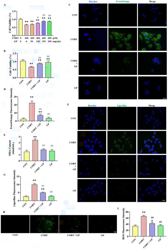 Effects of GPs on CORT-induced ferroptosis in PC12 cells. (A) Effects of different concentrations of GPs on the viability of PC12 cells treated with 400 μM CORT. (B) The viability of PC12 cells after different treatments. (C) Representative FerroOrange (green) positive cells immunofluorescence images at 400× magnification. Nuclei were stained with Hoechst (blue) in PC12 cells. Scale bar = 25 μm. (D) The fluorescence intensity of iron. (E) The content of MDA. (F) Representative Liperfluo (green) positive cells immunofluorescence images at 400× magnification. Nuclei were stained with Hoechst (blue) in PC12 cells. Scale bar = 25 μm. (G) The fluorescence intensity of LPO. (H) Representative ROS immunofluorescence images of PC12 cells at 200× magnification. Scale bar = 50 μm. (I) The fluorescence intensity of ROS. All data are presented as the mean ± SD (n = 6). * p < 0.05 and ** p < 0.01 versus CON group. # p < 0.05 and ## p < 0.01 versus CORT group.