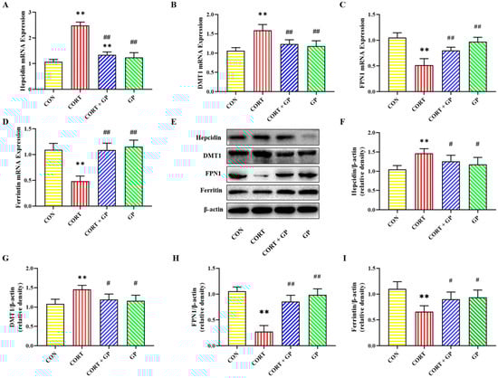 Effects of GPs on CORT-induced iron metabolism in PC12 cells. (A–D) The relative mRNA expression of Hepcidin, DMT1, FPN1, and Ferritin. (E) The relative protein expression of Hepcidin, DMT1, FPN1, and Ferritin. (F–I) The protein quantitative analysis of Hepcidin, DMT1, FPN1, and Ferritin. All data are presented as the mean ± SD (n = 6). ** p < 0.01 versus CON group. # p < 0.05 and ## p < 0.01 versus CORT group.