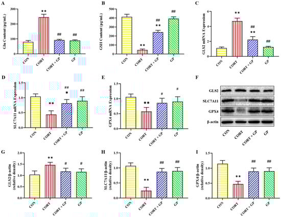 Effects of GPs on the CORT-induced Glu metabolism in PC12 cells. (A,B) The contents of Glu and GSH. (C–E) The relative mRNA expression of GLS2, SLC7A11, and GPX4. (F) The relative protein expression of GLS2, SLC7A11, and GPX4. (G–I) The protein quantitative analysis of GLS2, SLC7A11, and GPX4. All data are presented as the mean ± SD (n = 6). * p < 0.05 and ** p < 0.01 versus CON group. # p < 0.05 and ## p < 0.01 versus CORT group.