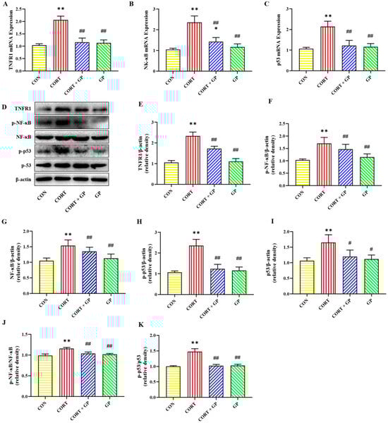 Effect of GPs on CORT-induced TNF-α/NF-κB signaling pathway in PC12 cells. (A–C) The relative mRNA expression of TNFR1, NF-κB, and p53. (D) The relative protein expression of TNFR1, p-NF-κB, NF-κB, p-p53, and p53. (E–I) The protein quantitative analysis of TNFR1, p-NF-κB, NF-κB, p-p53, and p53. (J) The protein expression ratio of p-NF-κB to NF-κB. (K) The protein expression ratio of p-p53 to p53. All data are presented as the mean ± SD (n = 6). * p < 0.05 and ** p < 0.01 versus CON group. # p < 0.05 and ## p < 0.01 versus CORT group.
