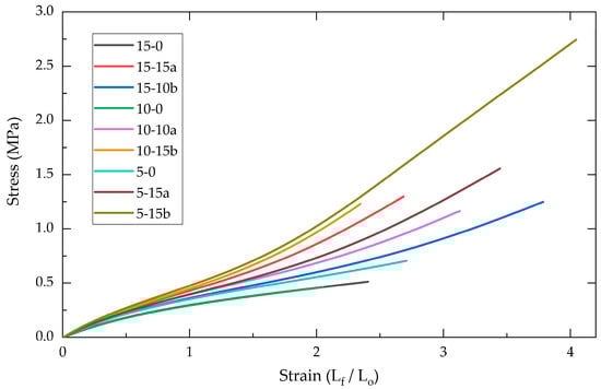 Tensile tests were conducted on the various PDMS-%SiO2 polymeric composites to determine the changes in mechanical behavior caused by different concentrations of SiO2 reinforcer (0%, 5%, 10%, and 15%) obtained via sol–gel synthesis in acidic (a) and alkaline (b) media. In Figure 1, the stress–strain profiles for the different study groups are presented, revealing a notable increase in both ultimate tensile stress and strain compared to the control unreinforced polymers (15-0, 10-0, and 5-0). In the unreinforced polymers, two primary processes were observed—one occurring between 0 and 0.4 MPa and another above 0.4 MPa—which corresponded to the elastic and plastic deformation stages, respectively [1].