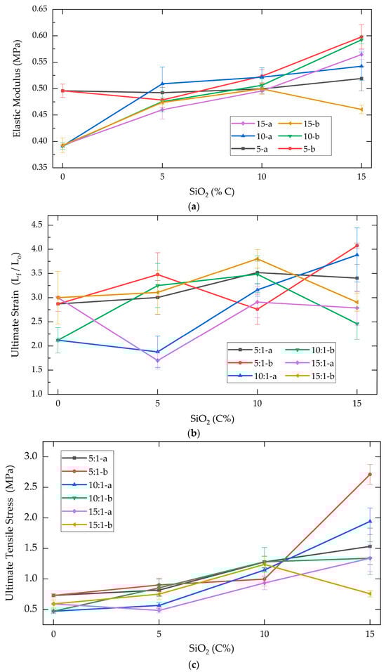 For composites with low SiO2 concentrations (5a and 5b), fracture stress values ranged from 0.484 to 0.901 MPa. Gradually, the fracture stress increased from 0.934 to 1.281 MPa for composites with a 10% reinforcement concentration (10a and 10b, respectively). At the highest reinforcement concentration (15% SiO2), most composites exhibited a considerable increase in ultimate tensile stress, thereby differing from the behavior at lower concentrations [26]. The composites with the highest fracture stress for each reinforcer (SiO2-a and SiO2-b) were 10-15a and 5-15b (1.94 and 2.71 MPa, respectively). This value represented an increase of 371% and 412% in comparison with its control groups.