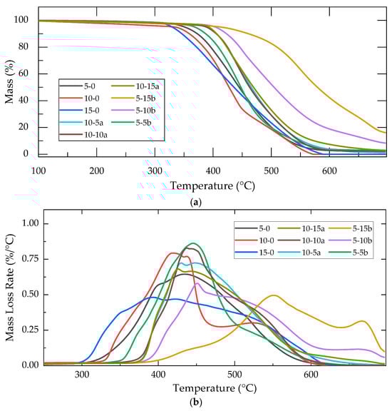 Figure 3a shows the weight loss profiles of the best mechanical composite subgroups, from the control groups 10-0 and 5-0 up to the highest concentrations, 10-15a and 5-15b. In Figure 3b, the weight loss rate of the composites, as the temperature increased to 700 °C, is represented.