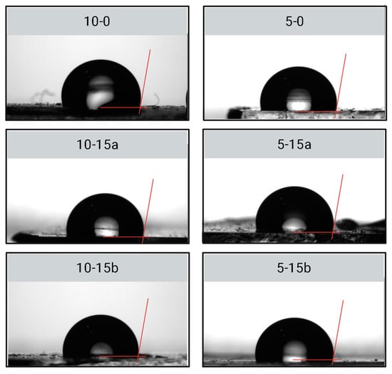 Hydrophobicity of composites was assessed by measuring the water contact angle in air on the surfaces of the selected PDMS composites (10-15a and 5-15b) as well as on control polymers. Images obtained from the contact angle tests are presented in Figure 4, and the measured angles in Table 5.