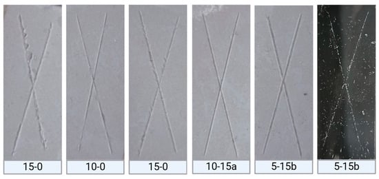 Composites were analyzed according to the ASTM D3359 standard based on the amount of material removed during testing, with six possible categories (A0–A5). The reinforced composites (10-15a and 5-15b) and their respective control groups (10-0 and 5-0) were classified as A4, indicating the formation of cross-cut marks on the tape after testing.