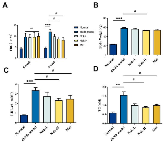 The effects of Nok on fasting blood glucose, blood lipids, and body weight in mice. (A) Fasting blood glucose (FBG); (B) body weight (C); low-density lipoprotein (LDL); (D) triglycerides (TG). All data are presented as mean ± S.E.M., with n = 6. ** p < 0.01 or *** p < 0.001 vs. Normal, # p < 0.05 vs. db/db model.