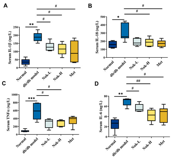 Inflammation plays a pivotal role in the progression and pathogenesis of diabetes. To investigate the effects of Nok on inflammation in db/db diabetic mice, we quantified serum levels of key inflammatory cytokines across all experimental groups. As shown in Figure 3, levels of interleukin-1β (IL-1β), interleukin-6 (IL-6), interleukin-18 (IL-18), and tumor necrosis factor-α (TNF-α) were significantly elevated in the db/db diabetic model group compared to the C57BL/6J control group (Figure 3). These findings indicate that db/db diabetic mice exhibit pronounced inflammation, likely driven by metabolic dysregulation of glucose and lipid homeostasis. In contrast, Nok treatment reduced the levels of these inflammatory cytokines relative to the untreated db/db model group, with the most notable reductions observed in the high-dose (100 mg/kg) Nok group. Specifically, serum concentrations of IL-1β, IL-6, and IL-18 were significantly decreased in this group (Figure 3A,B,D). These results demonstrate that Nok effectively attenuates inflammation in db/db diabetic mice. The positive control, metformin (Met), similarly exerted significant anti-inflammatory effects (Figure 3).