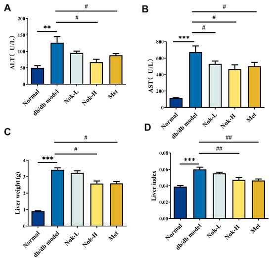 (A) Serum ALT levels; (B) serum AST levels; (C) liver weight; (D) liver index. All results are expressed as mean ± S.E.M., n = 6. ** p < 0.01 or *** p < 0.001 vs. Normal, # p < 0.05 or ## p < 0.01 vs. db/db model.
