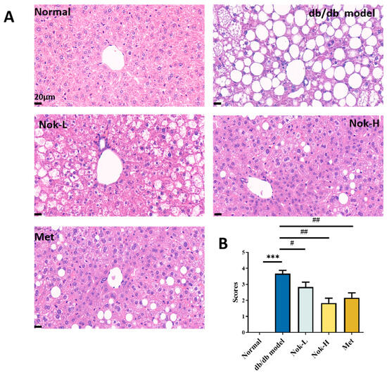 Effect of Nok on pathological changes in liver tissue of db/db diabetic mice. (A) HE staining of liver tissue; (B) pathological scoring results. Data are presented as mean ± SEM, n = 6. *** p < 0.001 vs. Normal, # p < 0.05 or ## p < 0.01 vs. db/db model.