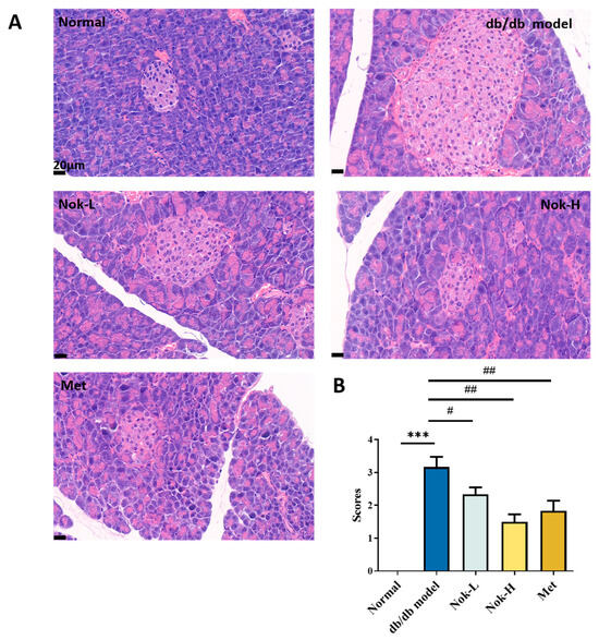 Effect of Nok on pathological changes in pancreatic tissue of db/db diabetic mice. (A) Histopathological results of HE staining; (B) pathological scoring results. Data are presented as mean ± SEM, n = 6. *** p < 0.001 vs. Normal, # p < 0.05 or ## p < 0.01 vs. db/db model.