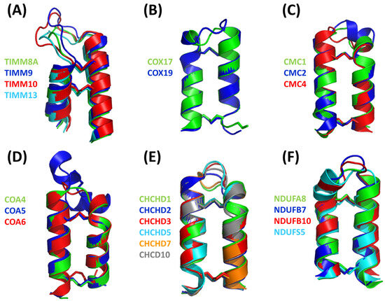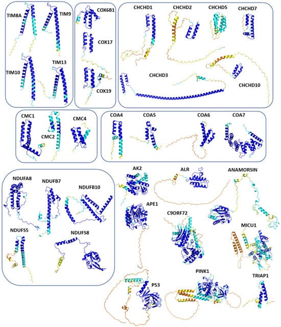 Previous studies, essentially realized in yeast, indicated that the prototypical nuclear-encoded redox-regulated substrates of the MIA or DRS pathway are small proteins, typically less than 25 kDa in size. The structure of these substrates is characterized by the presence of two α-helices, each bearing a pair of cysteine residues that are separated by either three or nine amino acid residues. Based on this feature, substrates were denoted either as twin CX3C or twin CX9C proteins [52,108,109]. Twin CX9C proteins present a characteristic coiled–coil–helix–coiled–coil–helix (CHCH) structural fold, which is stabilized, in their oxidized forms, by two disulfide bonds. Despite this common structural feature, these proteins exhibit remarkable variations at the primary sequence level that have somehow complicated the accurate prediction of their structural models [110]. The implication of these proteins in various physio-pathological contexts has been highlighted in various reviews [10,11,17,35,108,109,111]. For example, Modjtahedi and colleagues (2016) explored the role of CX9C motif-containing proteins in mitochondrial respiratory complexes’ biogenesis and their potential as therapeutic targets for human diseases, and showed the critical role of the hCHCHD4/yMIA40 import pathway in cell survival [11].