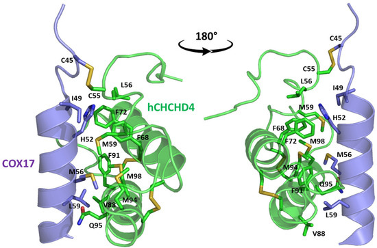 The interaction of the human oxidoreductase CHCHD4 (hereafter hCHCHD4) with its many substrates represents an illuminating example of the interplay between covalent and non-covalent interactions in the protein–protein recognition process. This mitochondrial protein, which is a member of the coiled–coil–helix–coiled–coil–helix domain (CHCHD) family, is the focus of multiple research activities in cell biology and biochemistry, particularly those related to mitochondrial metabolism, cell survival, and cellular responses to oxidative stress [10,11]. Since CHCHD4 and its protein substrates are emerging as a new class of proteins associated with various pathologies, it is of particular importance to define the role of the CHCHD4-dependent mitochondrial import pathway in health and disease, including mitochondrial disorders, neurodegeneration, and cancer [10,12,13,14,15,16,17,18,19,20,21,22,23,24,25,26,27,28,29,30,31,32,33,34,35,36,37,38].