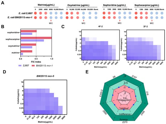 We investigated the potential bactericidal effects of four major alkaloid monomers derived from Sophora alopecuroides extractions that have been reported to exhibit antimicrobial activity. The results indicated that all four alkaloids exhibited modest bactericidal effects against mcr-1 positive E. coli strains, with a minimum inhibitory concentration (MIC) of 8000 µg/mL for matrine, 64,000 µg/mL for oxymatrine, and 5000 µg/mL for sophoridine and sophocarpine (Figure 1A). We further explored the synergistic effects of the four alkaloids in combination with colistin. Sophocarpine exhibited either indifference or an additive effect when combined with colistin, whereas matrine, oxymatrine, and sophoridine demonstrated synergistic enhancement of antibacterial activity against mcr-1 positive E. coli. Among these, the combination of matrine and colistin showed the highest synergistic activity. This synergistic effect was also observed in other clinically derived mcr-1-positive E. coli isolates (Figure 1C). We subsequently investigated the synergistic effects of matrine and colistin in other mcr variants. As expected, a synergistic effect was observed in mcr-5 carrying Enterobacteriaceae (Figure 1D). Given that CRE pose a serious public health threat, we also evaluated the potential synergy between matrine and meropenem against CRE. However, no synergistic effect was observed between matrine and meropenem (Figure 1E). Detailed MIC and fractional inhibitory concentration index (FICI) results are summarized in the Supplementary Materials Table S1.