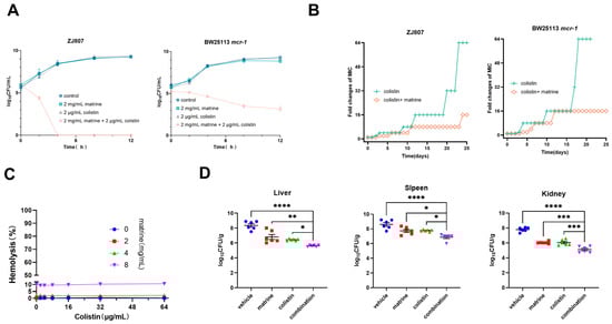Synergistic antimicrobial activity of matrine and colistin in vitro and in vivo. (A) Time-kill assays with colistin (2 μg/mL) in combination with matrine (2000 μg/mL). (B) Antibiotic resistance test of colistin in the presence and absence of matrine. (C) Hemolytic activity of colistin and matrine at different concentrations in sheep red blood cells. (D) Bacterial load in the liver, spleen, and kidney of a mouse model with abdominal infection by E. coli ZJ807. (* p < 0.05, ** p < 0.01, *** p < 0.001, **** p < 0.0001).