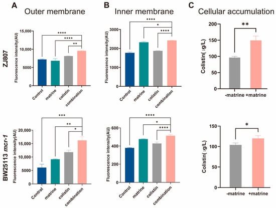 Matrine potentiates colistin-induced damage to bacterial membrane permeability and enhances intracellular colistin accumulation. (A) Outer membrane permeability. (B) Inner membrane permeability. (C) Intracellular colistin accumulation. Data are presented as mean ± SD of three biological replicates. Statistical significance was set at * p < 0.05, ** p < 0.01, *** p < 0.001, and **** p < 0.0001.