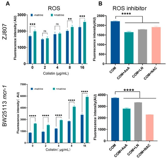 Effects of matrine and colistin on bacterial intracellular ROS levels. (A) ROS levels after treatment with colistin in the presence and absence of matrine. (B) ROS accumulation with the addition of inhibitors. Data are presented as mean ± SD of three biological replicates. Statistical significance was set at ** p < 0.01, *** p < 0.001, and **** p < 0.0001.