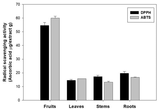 Based on this background, the antioxidant activity of extracts from the fruits, leaves, stems, and roots of eggplant was evaluated using two radical scavenging assays, DPPH and ABTS. Both methods assess the free radical scavenging ability of antioxidants, and the corresponding data are shown in Figure 1. The fruits exhibited the highest antioxidant activity, with values of 54.61 μg ascorbic acid/g in the DPPH assay and 59.96 μg ascorbic acid/g in the ABTS assay. This indicates that the antioxidant substances in the fruits possess strong free radical scavenging ability in both methods.