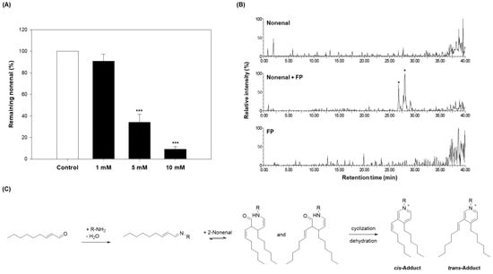 From a chemical structural perspective, 2-nonenal is an α, β-unsaturated aldehyde that exhibits high reactivity toward nucleophilic functional groups. The C-3 double bond in 2-nonenal is electrophilic, making it susceptible to nucleophilic attack. Additionally, the aldehyde group at C-1 can react with an amine group to form a Schiff base [36]. Based on this reactivity, when a target compound combines with 2-nonenal, a new adduct is formed, through which 2-nonenal can be removed.