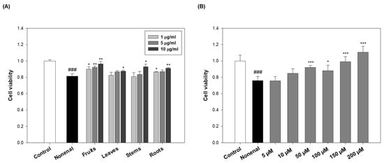 Effects of eggplant extracts and N-trans-feruloylputrescine (3) on 2-nonenal-induced damage in human keratinocytes. (A) Cell viability of HaCaT cells pre-treated with eggplant extracts (fruits, leaves, stems, and roots) at various concentrations (1, 5, and 10 µg/mL) for 2 h, followed by exposure to 2-nonenal (100 µM) for 24 h. (B) Cell viability of HaCaT cells pre-treated with N-trans-feruloylputrescine (3) at concentrations ranging from 5 to 200 µM for 2 h, followed by exposure to 2-nonenal (100 µM) for 24 h. These data are expressed as mean ± SD of 3 independent experiments. ### p < 0.001 vs. control; * p < 0.05, ** p < 0.01 *** p < 0.001 vs. 2-nonenal.