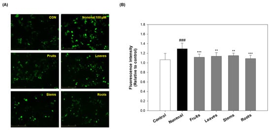 As a result, cell viability decreased by approximately 20% compared to the control group after 2-nonenal treatment. However, pre-treatment with eggplant extracts from various parts effectively rescued keratinocyte viability against 2-nonenal-induced damage (Figure 5A). Among them, the fruits showed the most pronounced protective effect, improving cell viability by approximately 10–18%, depending on the concentration. Leaves, stems, and roots also conferred protective effects, although to a lesser extent compared to the fruits, with viability improvements generally ranging from about 1–14%. These results suggest that all parts of the eggplant exhibit some protective activity, but the fruits are the most potent in mitigating 2-nonenal-induced cytotoxicity.