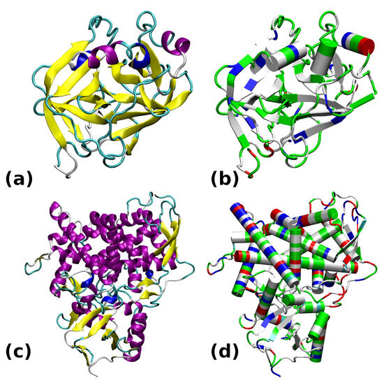 Structures of the studied proteins: (a) Trypsin 6B6T colored by secondary structure. (b) Trypsin 6B6T colored by residue types. (c) CYP51 5FSA colored by secondary structure. (d) CYP51 5FSA colored by residue types. The secondary structure color coding: -helix—purple; 310-helix—blue; -strand—yellow; turn—cyan; random coil—white. Color coding of residue types: basic—blue; acidic—red; polar—green; apolar—white.