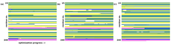 Secondary structure changes in the structural optimization of trypsin. (a) AM1 optimization. (b) GFN2-xTB optimization. (c) GFN-FF optimization. Color coding of the secondary structure: -helix—purple; 310-helix—blue; -strand—yellow; turn—cyan; random coil—white.