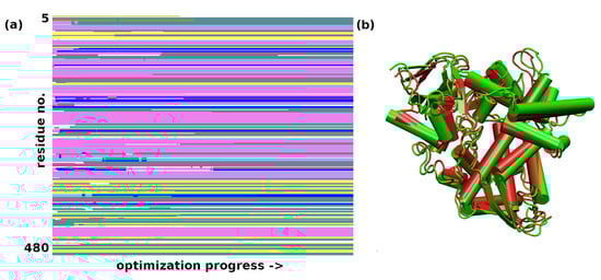 (a) Secondary structure changes in the structural optimization of sterol 14-demethylase during the GFN-FF optimization. Color coding of the secondary structure: -helix—purple; 310-helix—blue; -strand—yellow; turn—cyan, random coil—white; (b) A comparison of the first (green) and last (red) frame of the force-field optimization.