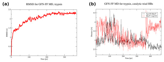 (a) The RMSD in the first 365 ps of the GFN-FF MD run for trypsin. (b) The donor–acceptor distance time evolution for the catalytic triad hydrogen bonds in the full 480 ps GFN-FF MD run for trypsin.