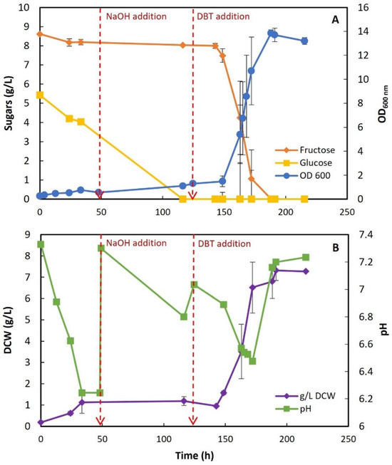 Time-course profiles for cellular growth, sugar consumption, and pH of Gordonia alkanivorans strain 1B cultivated in shake flasks with STFr-liquor containing 14 g/L of reducing sugars at 30 °C and 150 rpm. (A)—OD600 and sugar (fru/gluc) consumption; (B)—DCW and pH variation. Red lines in plots (A,B) illustrate the time of NaOH/DBT addition. Standard deviation (n = 2) is represented by the error bars.