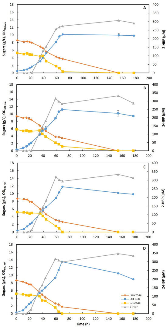 Therefore, the first set of assays was carried out using a mix of commercial fructose and glucose (Fru + Glu) in 6:4 ratio, respectively. Culture conditions were maintained as previously established [10,11] (i.e., a 1 L vase with 435 mL SFMM medium supplemented with 10 g/L of total sugars, at 30 °C, pH 7.5, 410 rpm agitation, 2 vvm aeration rate, and 0.05 h−1 dilution rate) for five turnovers of the culture medium, after which it was considered that the steady state was achieved.