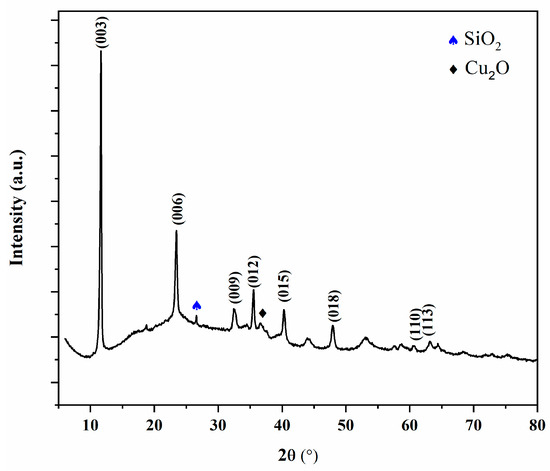 CuAl-LDH exhibited characteristic diffraction peaks at 11.7°, 23.4°, 35.5°, 47.8°, 58.7°, and 63.1°, corresponding to the (003), (006), (012), (015), (018), (110), and (113) crystal planes, respectively, indicating the layered structure of the material [34,35]. The reflections associated with the (003), (006), and (012) planes are sharp, intense, and symmetrical, suggesting high crystallinity of the sample. These strong low-angle peaks also indicate a significant interlayer spacing, a typical feature of well-ordered layered structures [4]. At higher 2θ values, broader and less intense peaks corresponding to the (015), (110), and (113) planes were observed, which is characteristic of the reduced long-range order in those directions. Additionally, the presence of a distinct diffraction peak corresponding to silica (SiO2) confirms the successful synthesis of the CuAl-LDH@SiO2 composite via the co-precipitation method. During synthesis, the addition of NaOH and a small amount of cuprous oxide (Cu2O) at approximately pH 6 led to the formation of Cu2O as a secondary phase [36].