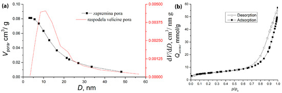 The porosity of the synthesized SiO2 composite was assessed using nitrogen adsorption/desorption porosimeter. The obtained isotherm (Figure 6a) corresponds to type IV [38], which is characteristic of mesoporous silica materials. The sample shows the presence of both macropores and mesopores, as evidenced by the sharp increase in the adsorption isotherm at p/p0 > 0.9 and the presence of a hysteresis loop. The pore size distribution curve (Figure 6a), calculated using the BJH method from the desorption branch, reveals a unimodal pore size distribution, with a predominant pore size of approximately 13.5 nm. The specific surface area, determined using the Brunauer–Emmett–Teller (BET) method, is 19.1 m2/g, which is relatively high compared with pure commercial SiO2. These results suggest that the synthesized LDH also contributes to the overall surface area of the material [39].