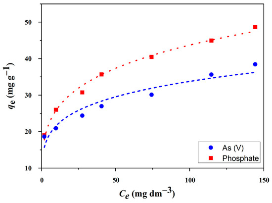 Isotherm modeling showed that the Freundlich model better described the sorption behavior, with Freundlich constants (KF) of 15.4 L mg−1 for PO43− and 13.9 L mg−1 for As(V) and n values of 4.41 and 5.18, respectively—both within the favorable adsorption range of 1 to 10.