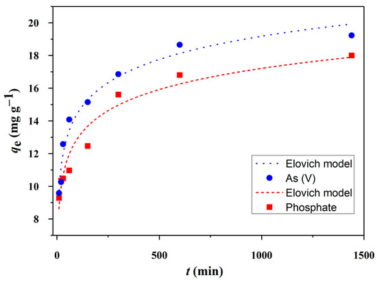 The initial phase of phosphate and As(V) adsorption onto CuAl-LDH@SiO2 was characterized by rapid uptake. Within the first 10 min, phosphate adsorption reached approximately 52% of its equilibrium capacity, while As(V) adsorption was slightly lower at 50% (Figure 8). This rapid phase was followed by an adsorption phase, which is attributed to intraparticle diffusion and adsorption onto the internal surface sites of the porous adsorbent. Based on the regression coefficient (R2) values and the standard errors of the model parameters (Table 3), the adsorption kinetics are best described by the linear form of the Elovich model. Originally developed to describe the chemisorption of gases on solid surfaces, the Elovich equation has been widely applied to adsorption systems. The high R2 values and low chi-square (χ2) values confirm that the Elovich model provides the best fit for the experimental data, in agreement with the findings by Farouq et al. [40]. Similar kinetic behavior has been reported for various adsorption systems involving metal ions (Pb2+, Cr3+, Cr6+, Cd2+, Cu2+, Se4+, As5+, K+, etc.) and dyes, as demonstrated in the study by Wu et al. [41].
