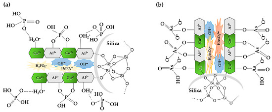 Proposed adsorption mechanism: (a) phosphate adsorption; (b) arsenate adsorption.