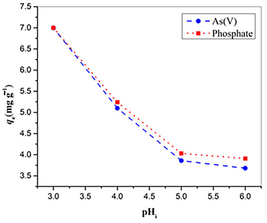 The four selected pH values for the real water sample were set below the pHpzc value (6.51). As shown in Figure 10, the lowest measured adsorption of arsenate and phosphate occurred at pH 6, with values of 3.68 and 3.91 mg g−1, respectively. At pH 5, there was a slight increase in adsorption, reaching 3.86 mg g−1 for arsenates and 4.03 mg g−1 for phosphates. At pH 4, arsenate uptake increased to 5.1 mg g−1 and phosphate uptake to 5.24 mg g−1. Finally, at pH 3, the entire amount of arsenate/phosphate was removed from the water. Experiments using the real water matrix demonstrated the material’s strong ability to effectively remove arsenate and phosphate from real water samples, indicating that it could be applicable outside of laboratory conditions.