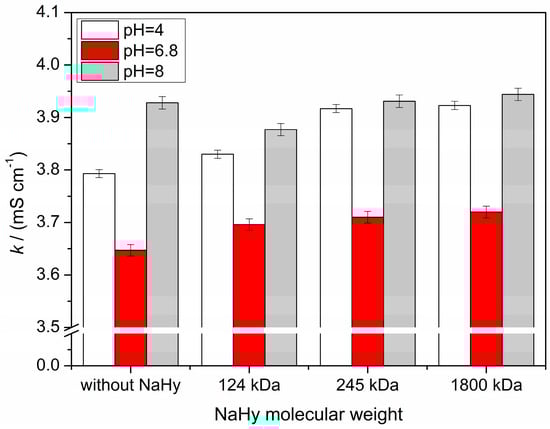 | Sodium hyaluronate (Mw = 245 kDa) 0.01 g in 10 mL (0.1%) + Water | 4.0 6.8 8.0 | 0.880 ± 0.010 0.708 ± 0.007 0.580 ± 0.003 |